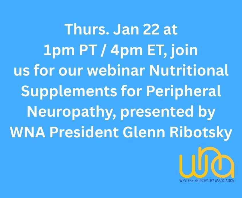 Join us on Thurs, Jan. 22 at 1pm PT / 4pm ET for our webinar Nutritional Supplements for Peripheral Neuropathy, presented by WNA President Glenn Ribotsky URL https://www.pnhelp.org/webinar-nutritional-supplements-peripheral-neuropathy Weight 1